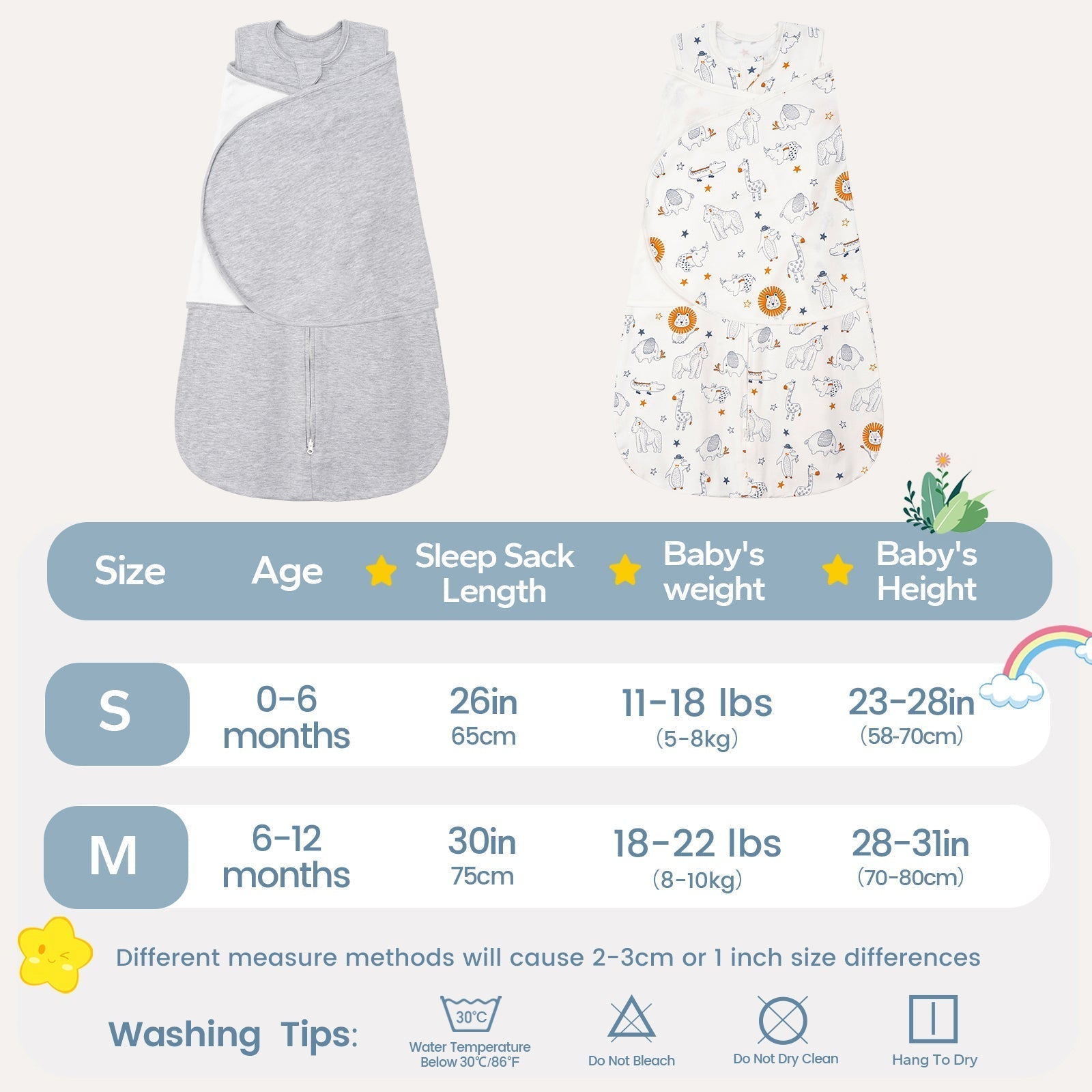 • 1.0 Tog, Value 2-Piece Combo Set: 1.0 Tog 2 - Piece Combo Set: The transitional swaddle is 100% cotton, natural & skin - friendly. Its breathable fabric safely touches baby's sensitive skin for comfort. With a 1.0 tog, it's for 68 - 75°F (20 - 24°C) rooms, suitable year - round.We have 2 sizes available: S fits for 0-6 months, up to 28in height/18lbs weight and M fits for 6-12 months, up to 31in height/22lbs weight