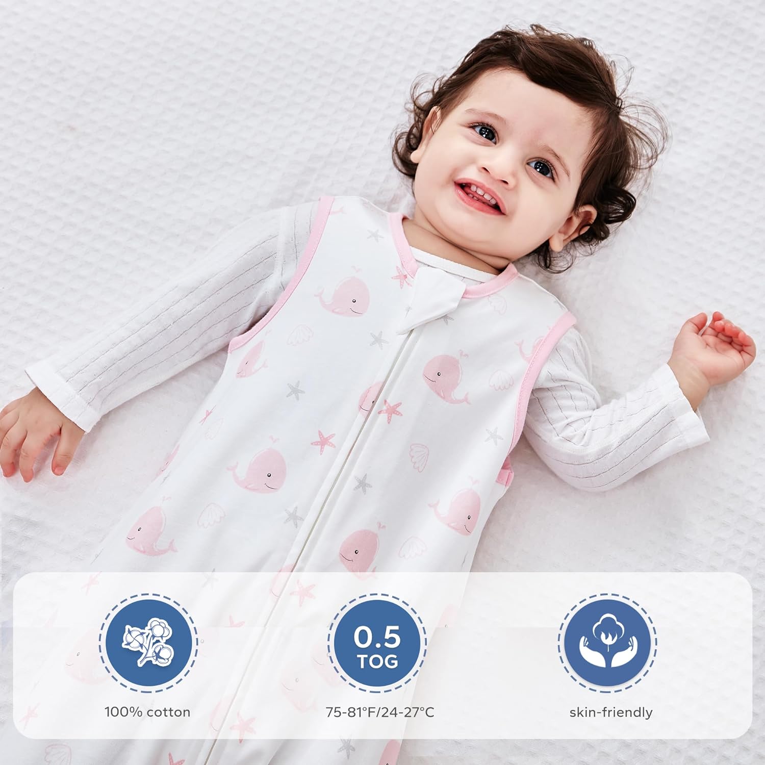 • 【Baby Comfort ❤】Made of 100% soft cotton for ultimate comfort, our sleep sack has a TOG rating of 0.5 and increased breathability to prevent overheating. Perfect for year-round use in room temperatures ranging from 75-81°F/24-27°C, especially during warm spring and summer months.