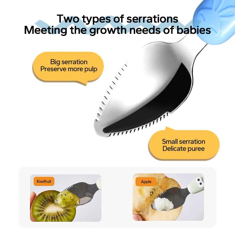 1. The serration allows the baby fruit spoon to quickly scrape food off easily. Not only can it be used to remove the sections of grapefruit, citrus, kiwi, lemon, etc. It can also be used to make apples, strawberries and avocados into baby puree, and it can also be used to dig out pumpkin seeds or eat dessert Ice cream etc. Safer and easier than knife.